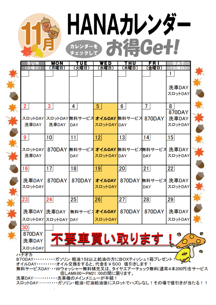 HANAカレンダーをチェックして11月もお得に当店をご利用ください(*’▽’)