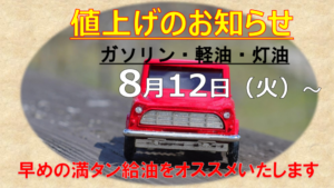 8/12(火)よりガソリン・軽油・灯油が値上げとなります(´・ω・)💦