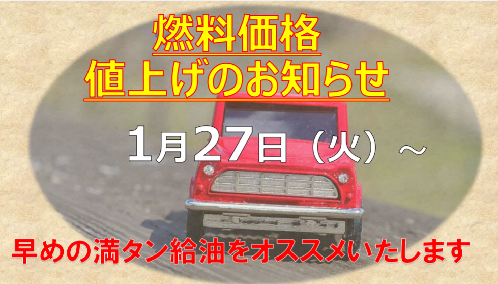 値上げのお知らせ 2026.01.23 いつもご利用ありがとうございます!!ライトパーク浅川SSです(^^)/🎵 ⛽値上げのお知らせ⛽ 1/27(火)より燃料価格が値上げとなります😢 早めの満タン給油をオススメ致します! Tweet Share Pocket スロットDAY・洗車DAYのお知らせ前の記事