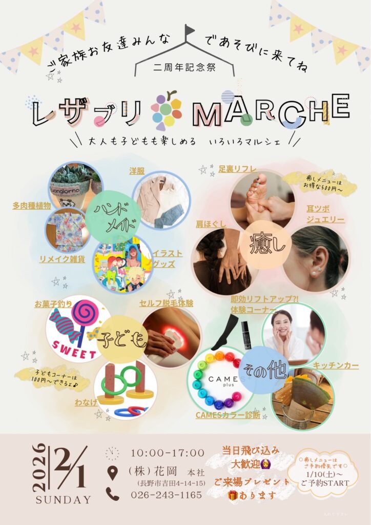 ☆メニュー☆ ・足裏リフレクソロジー 15分 500円 ・肩ほぐし 15分 500円 ・耳ツボジュエリー 30分 1000円 矢印上記メニューはご予約者さま優先となります! ・CAMESカラー診断 5分 300円 ・即効リフトアップ?!商品体験コーナー 無料 ・セルフ脱毛体験5分 100円 (手or腕からお選びいただけます★) ・お菓子釣り 1回 100円 ・わなげ1回 100円 お子さまコーナーには、DVD鑑賞スペースもございます ☆ハンドメイド☆ ・多肉腫植物 ・洋服基 ・リメイク雑貨 ・イラストグッズなど 可愛くて素敵な商品がたくさんあります また、キッチンカーの販売もございます ご新規さまも大歓迎ですので、ご家族、お友達みなさんで是非遊びに来てくださいね! 当日飛びこみ参加も大歓迎です! ※癒しメニューのご予約は1/10(土)より受付開始となります! 店頭または公式ライン /お電話にてお待ちしております 026-217-5853